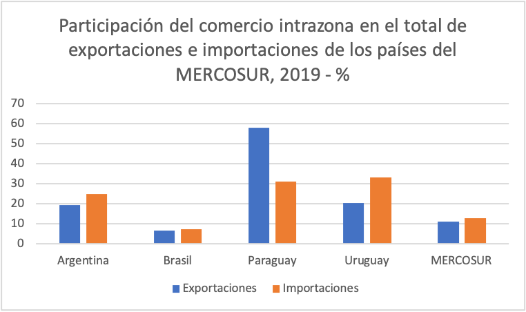 La segunda es que el modelo de integración elegido fue de una enorme ambición: la constitución de un mercado común. Como era de esperar el objetivo resultó incumplible, en gran medida porque carecía de realismo. Si bien es cierto que con el correr del tiempo se abandonaron los compromisos más exigentes, el estándar de evaluación quedó atado a la elección fundacional. Los esfuerzos por contornear las dificultades no arrojaron mayores resultados en el plano económico. Los niveles de comercio intrazona son bajos, 12% en 2019, lo cual denota pobres resultados en materia de integración económica, uno de los objetivos principales del acuerdo (Gráfico I). La importancia relativa del mercado regional es muy diferente para cada uno de los socios (Gráfico II). Tampoco el MERCOSUR fue exitoso como proyecto de regionalismo abierto. Hasta 2019, cuando se concluyeron las negociaciones con Europa, el bloque no había logrado acuerdos comerciales de importancia. Este es un contraste marcado cuando se lo compara con otras experiencias en América Latina.