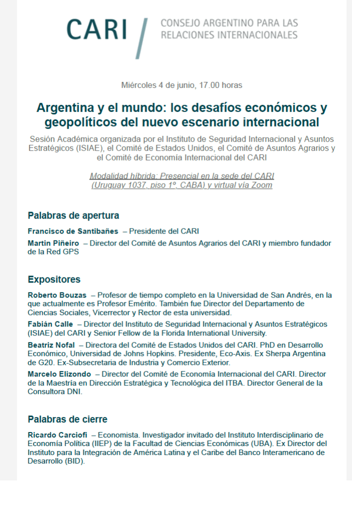 A comienzos del mes de junio se llevó a cabo en el CARI un seminario para analizar la situación de Argentina frente al nuevo escenario internacional, con especial atención a los aspectos geopolíticos y económicos. El interés principal consistió en poner el foco sobre cómo articular la relación con EEUU, China y Brasil, en el marco de la pertenencia de Argentina al MERCOSUR. actividad fue organizada por el Instituto de Seguridad Internacional y Asuntos Estratégicos, el Comité de EEUU, el Comité de Asuntos Agrarios y el Comité de Economía Internacional del CARI.