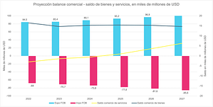 Balanza comercial. Se proyecta un superavit del comercio de bienes de + us$ 15 mm anual hasta 2027. Crecimiento y preservación del superávit de comercio no es un patrón frecuente. Asimismo, balanza de servicios: se prevé un saldo positivo a partir de 2024. Sin embargo, la cuenta de servicios ha sido negativa: en 2017 y 2018, -6,0 mm y -5,0 mm dólares respectivamente. Cabe esperar que la regularización creciente de los flujos turísticos habrán de impactar, como ha sido habitual en Argentina, en el turismo emisivo. De la misma manera debería operar una mayor normalidad en el mercado y régimen cambiario.
