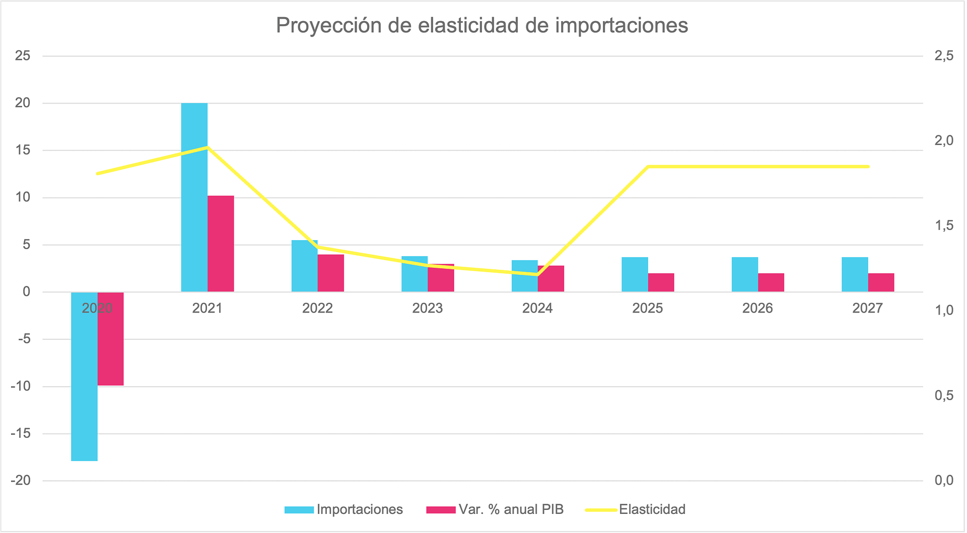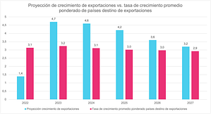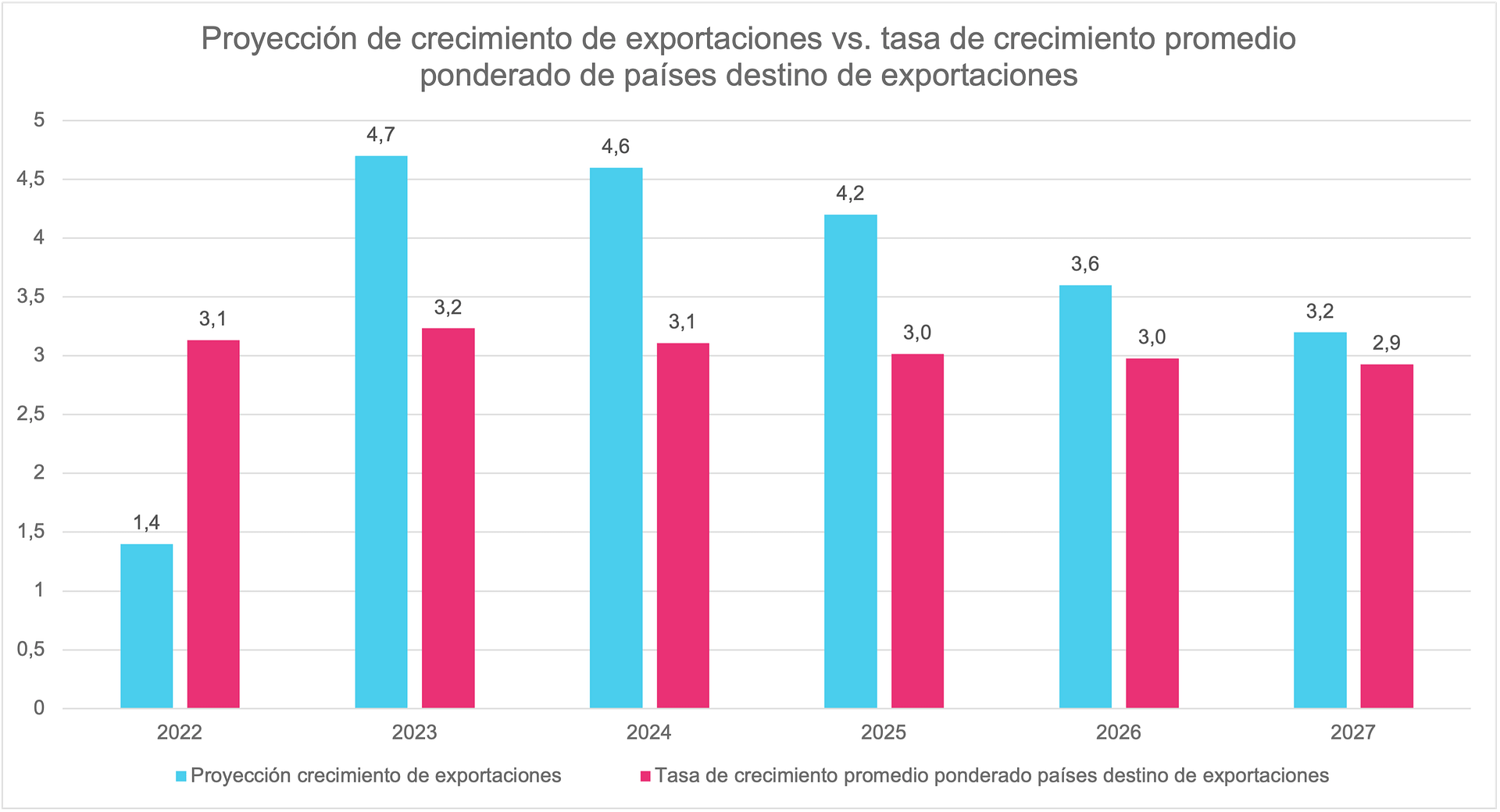Exportaciones de bienes. Llama la atención la tasa de crecimiento de las exportaciones de bienes y el posible desempeño de los mercados de destino. Las exportaciones crecen a mayor tasa que el crecimiento ponderado (según los % de 2021) de los países compradores. El criterio de proyección implica aumentar el market share en los mercados de destino.