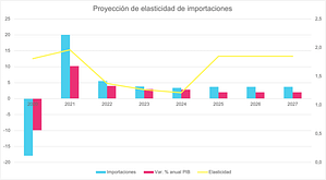 Elasticidad de importaciones. La relación entre crecimiento de las M y crecimiento (elasticidad de M) es, como mínimo, «singular». Un coeficiente plausible (y conservador) es aproximadamente 2. El valor de 2021 sirve como referencia. Sin embargo, la contracción del coeficiente de elasticidad en 2022-24 llama la atención. Esos son, casualmente, los años del programa. Obsérvese que el coeficiente vuelve a niveles más compatibles con los datos históricos en el período 2025-27.