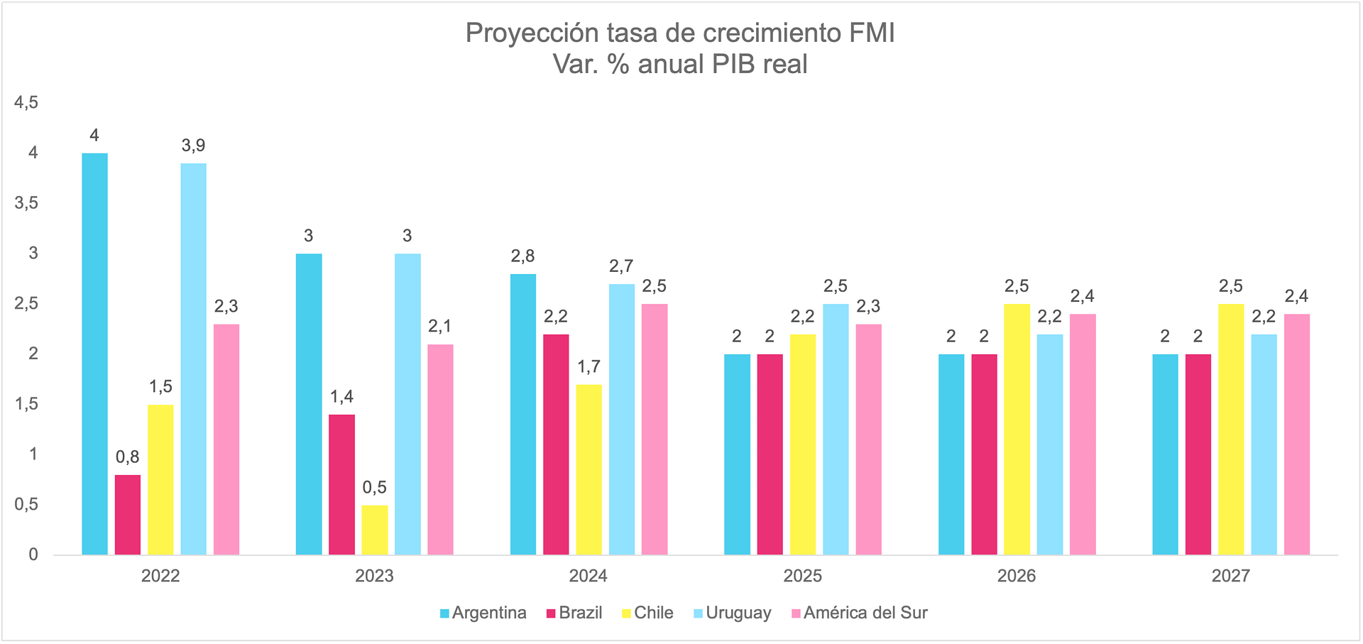 Crecimiento. Si se compara el informe del Staff con la última actualización del panorama económico global y regional conocido en las Reuniones de Primavera (abril), Argentina exhibe una tasa de crecimiento mayor al promedio regional hasta 2024 inclusive. En ese lapso también supera a Brasil.