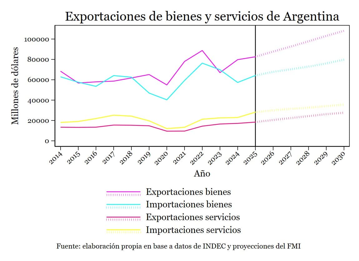 El panorama que se ha trazado arriba está implícitamente recogido en las proyecciones que realiza el FMI y que están incorporados en el programa económico en ejecución, en el marco de la ampliación del acuerdo de Facilidades Extendidas firmado en abril de 2025. Como se observa en el siguiente gráfico, a partir del año actual se expanden las exportaciones de bienes (tasas de 6-8% anual) que permiten la obtención de un balance comercial superavitario de bienes y que compensa el déficit de la cuenta de servicios.