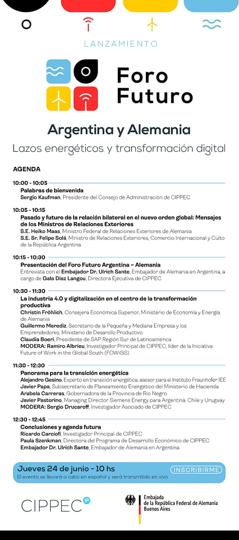 El pasado 25 de junio se llevó a cabo el Foro Futuro, una actividad apoyada por la Embajada de Alemania y el CIPPEC, en el marco de la cooperación bilateral de dicho país y Argentina. El Foro fue inaugurado por los respectivos ministros de relaciones exteriores de ambos países, lo cual es indicativo de la importancia asignado al mismo. El programa de cooperación prevé realizar otra actividad de corte académico en el segundo semestre de 2021.