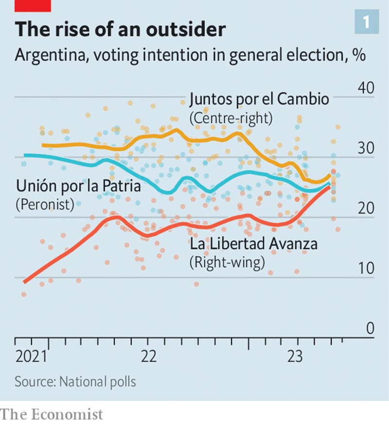 El Sr. Fernández y su vicepresidenta, Cristina Fernández de Kirchner (sin parentesco), han dicho que no se postularán para el cargo. Los potenciales aspirantes peronistas incluyen a Eduardo de Pedro, un protegido de Fernández, y Sergio Massa, el ministro de Economía, aunque no ha anunciado formalmente que se postulará. Ninguno de los dos es muy popular. En cambio, las encuestas están dominadas por la oposición de centroderecha, Juntos por el Cambio («Juntos por el Cambio» o jxc), y La Libertad Avanza, el partido de Javier Milei, un congresista libertario (ver gráfico 1).