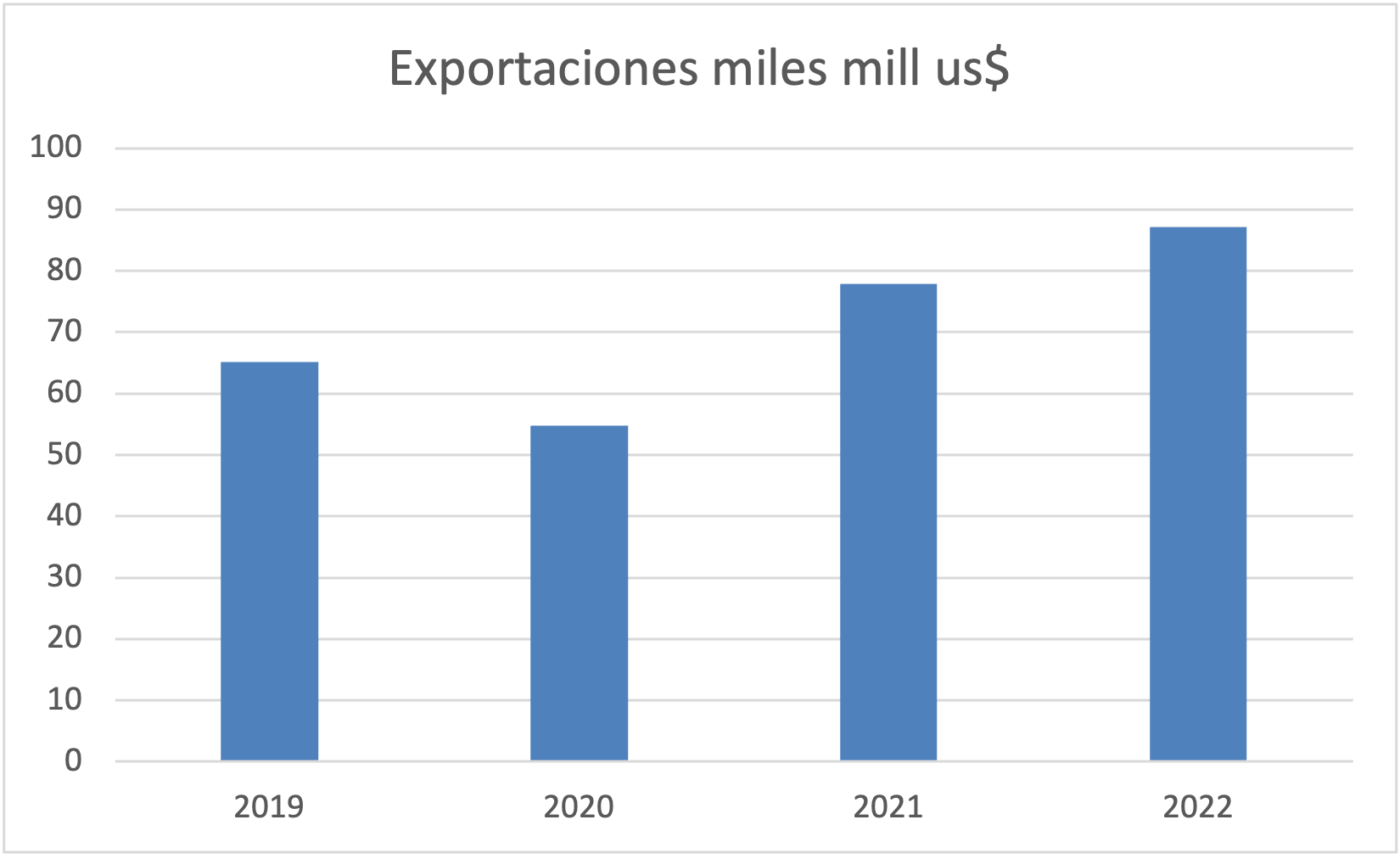 Una reciente proyección de Bolsa de Comercio de Rosario (BCR) estima que las exportaciones de bienes 2022 serían 87,2 mm us$. De cumplirse el pronóstico de BCR, éste significaría un incremento de 11.9% respecto de las exportaciones de 2021 y +33,9% versus 2019, último registro antes de la pandemia. Este nivel de exportaciones constituye un récord para la última década y es muy similar a 2011 (82,9 mm us$), punto máximo de la serie desde los años 2000, medida en valores corrientes.