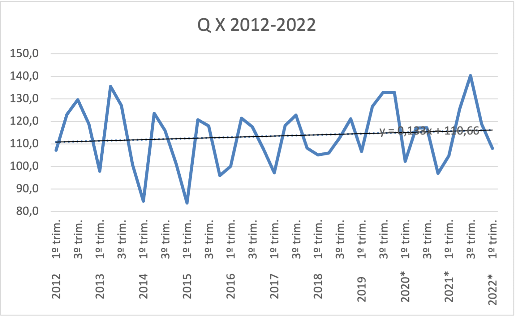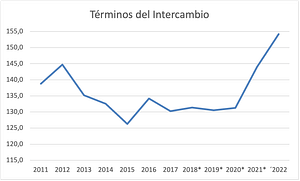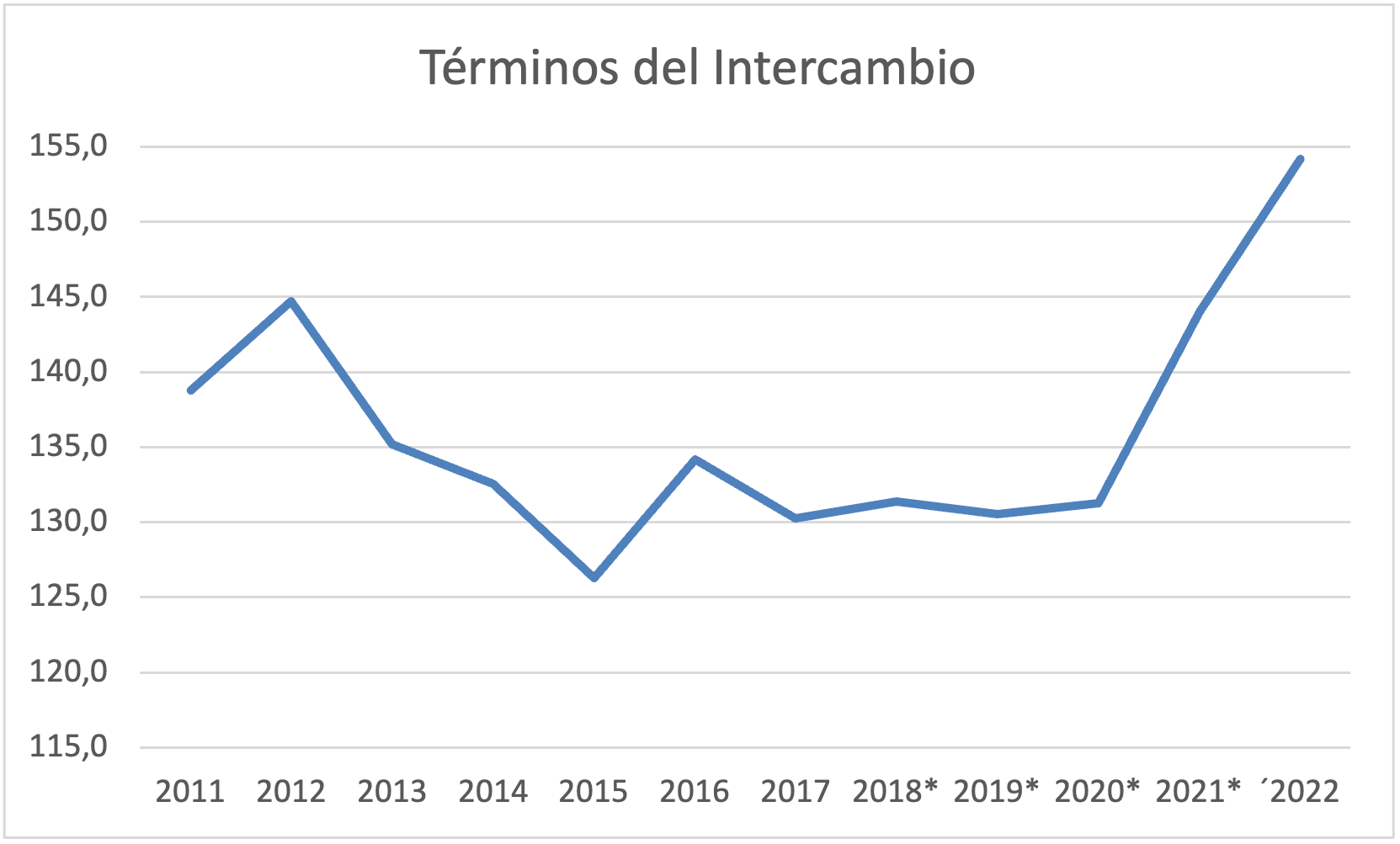 La clave para explicar este resultado extraordinario del balance externo reside en la evolución de los términos del intercambio. En I trim 2022 fueron +7,8% respecto del promedio 2021 y +6,8% respecto del IV trim 2021, tal como se muestra en el gráfico siguiente.
